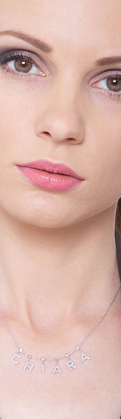 Collana in oro bianco 18k, con il nome CHIARA incastonato di diamanti taglio brillante colore G e Purezza Vs. Altezza lettere 7 mm. Le lettere sono agganciate a cipolline con diamante.