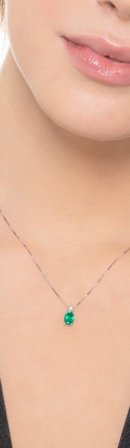 Collana in oro bianco 18k con incastonato smeraldo centrale di circa 7x5 mm e diamante taglio brillante, colore G e purezza Vs.