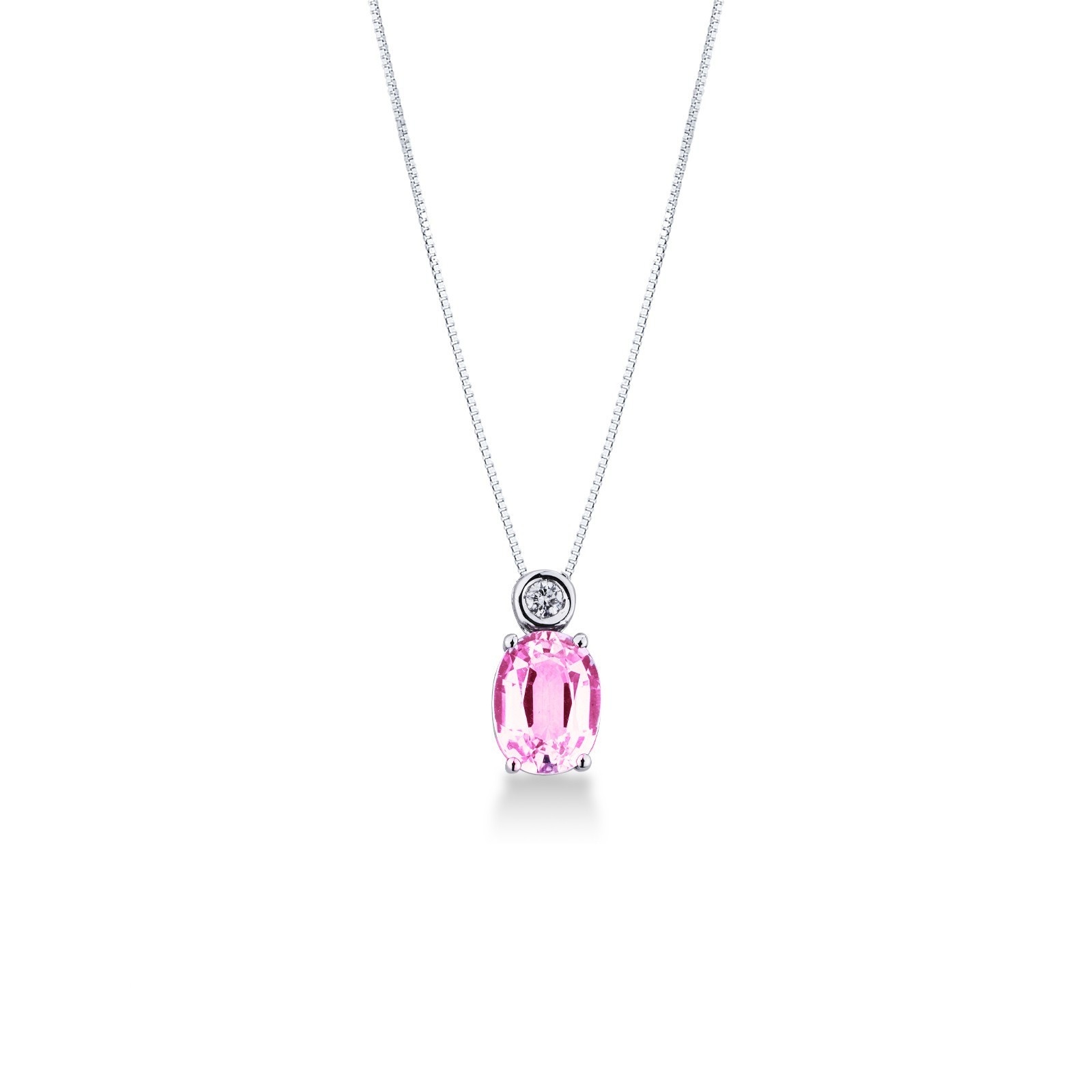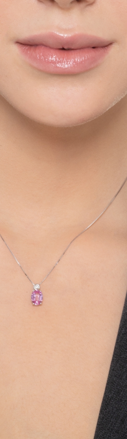 Collana in oro bianco 18k con incastonato zaffiro rosa centrale di circa 8x6 mm e diamante taglio brillante, colore G e purezza Vs.