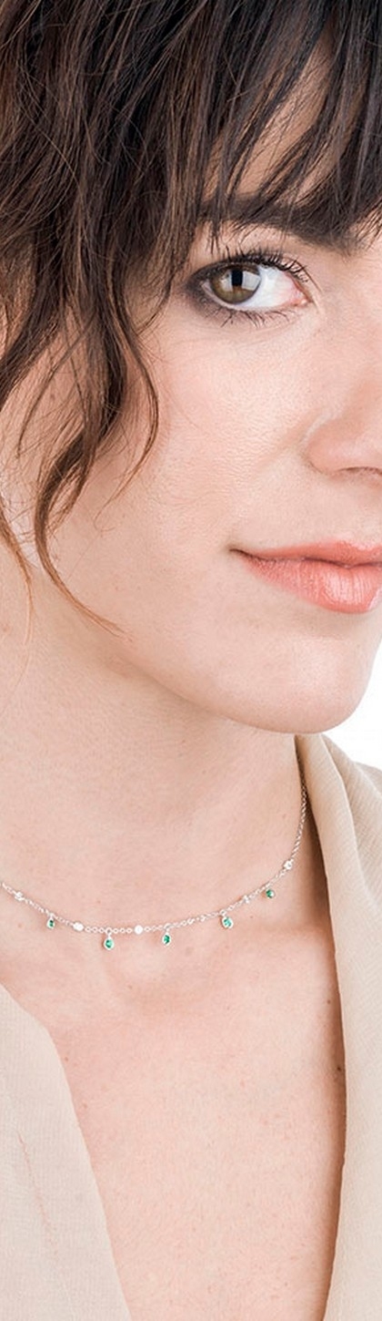 Collana con pendenti a goccia in oro bianco 18k con diamanti e smeraldi
