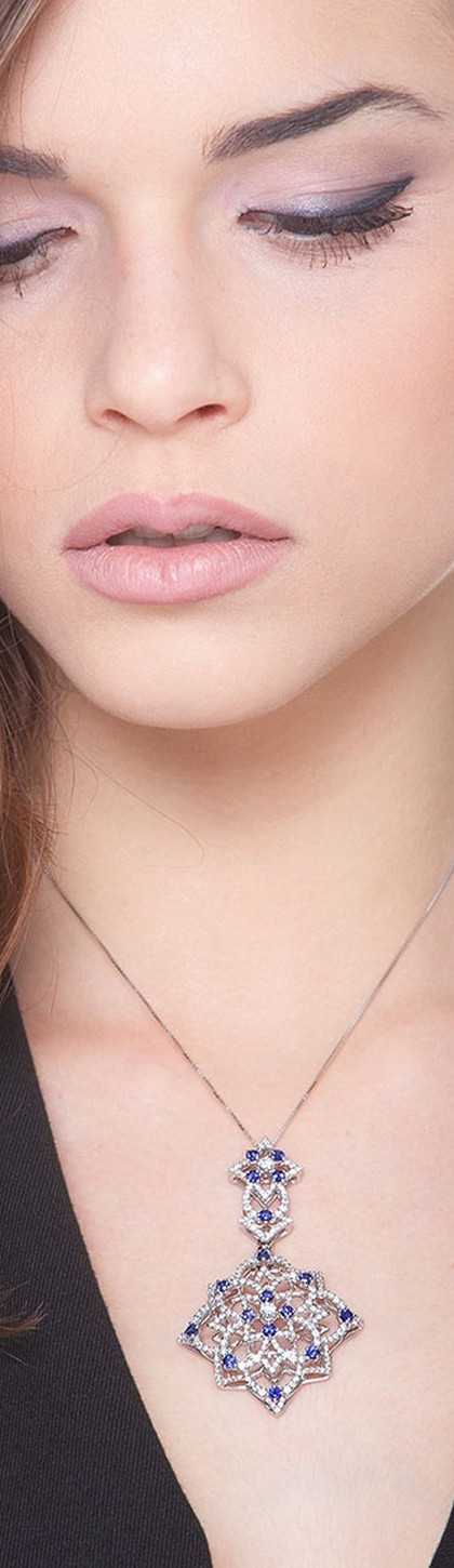 Collana con pendenti a rosone in oro bianco 18k con zaffiri blu e diamanti