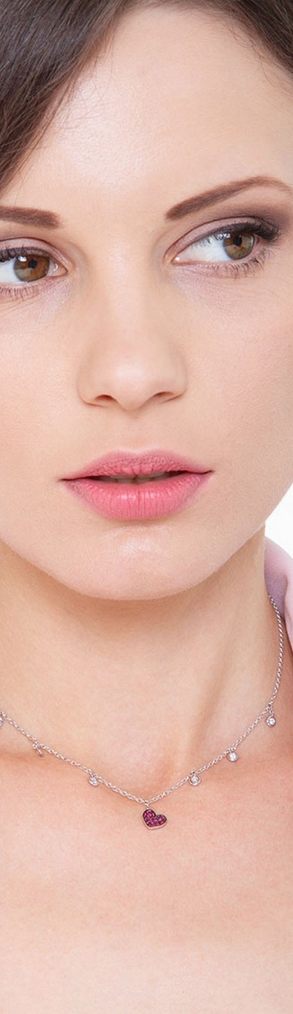 Collana con pendenti cuore e punto luce in oro bianco 18k con diamanti e rubini.
