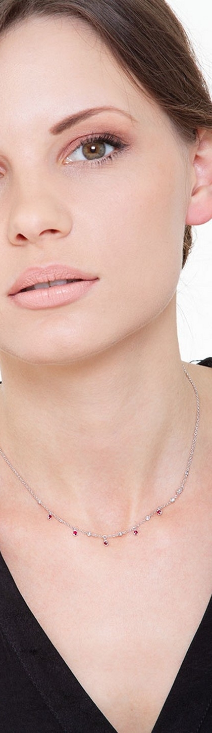 Collana in oro bianco 18k, con incastonati su pendenti a goccia rubini taglio brillante e diamanti taglio brillante colore G purezza Vs.