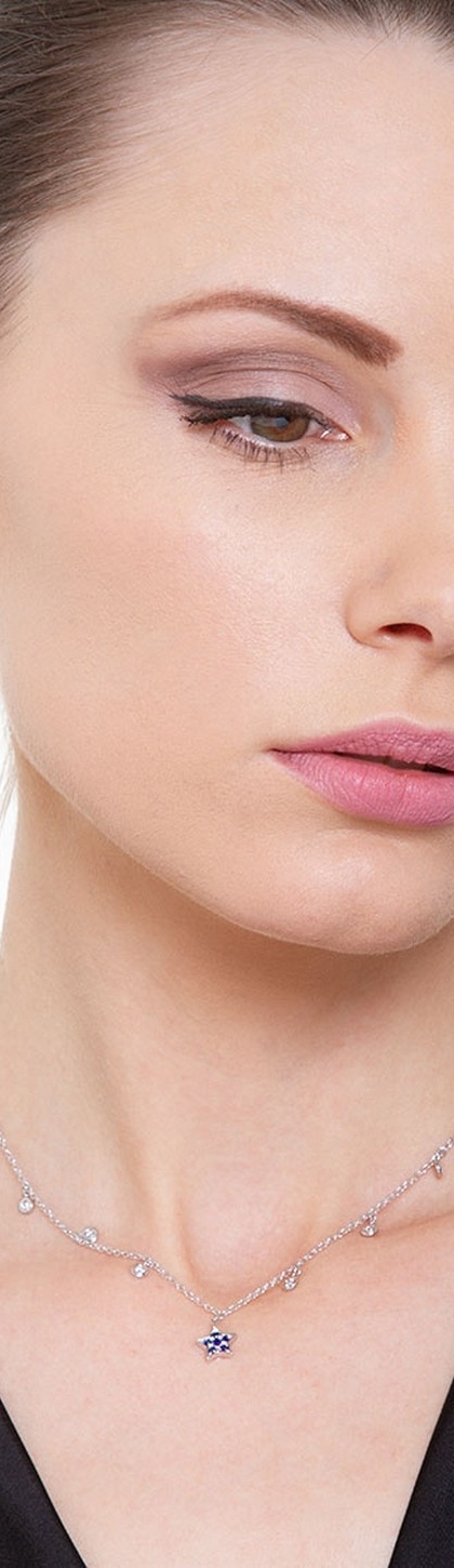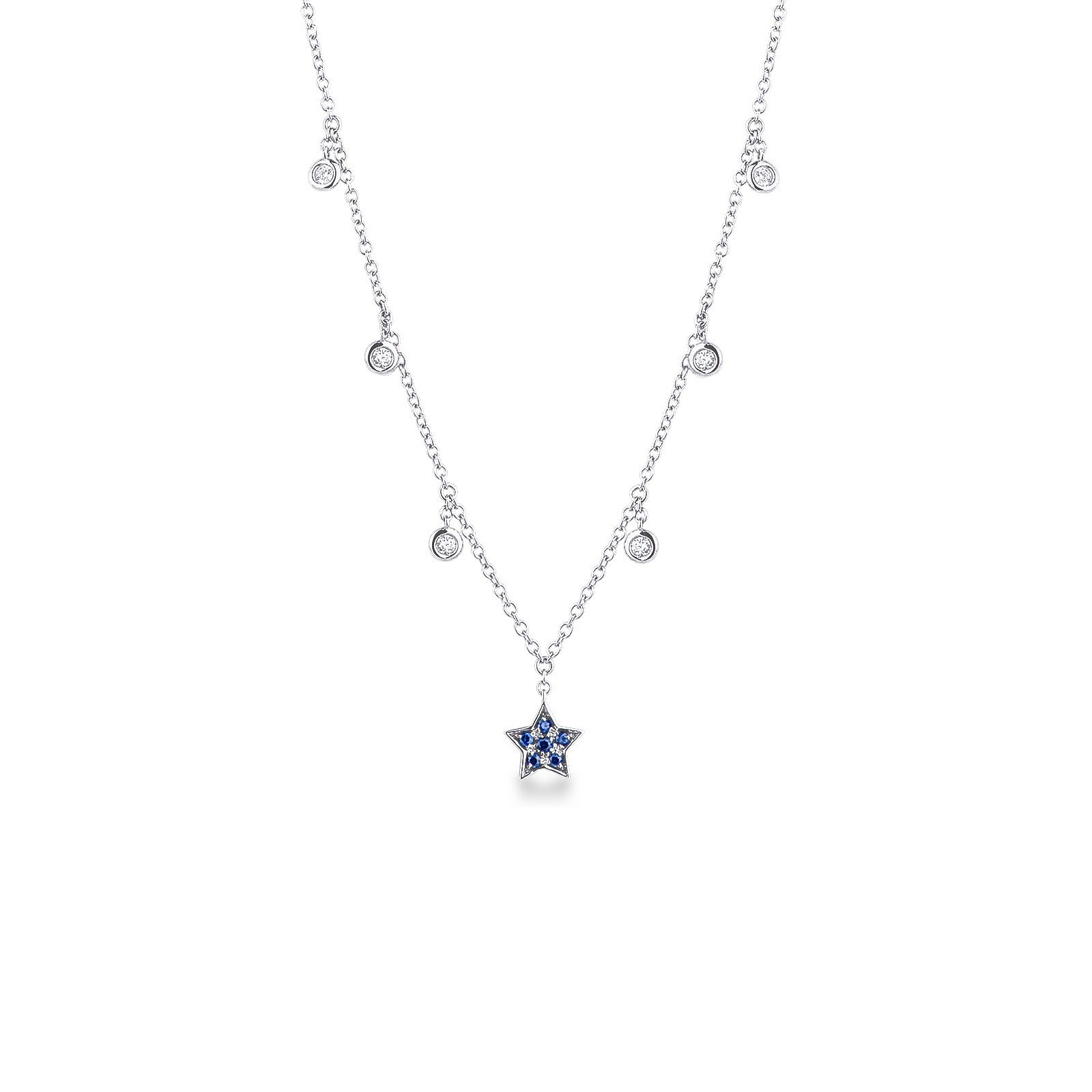 Collana con pendenti punto luce e stella in oro bianco 18k con diamanti e zaffiri blu.
