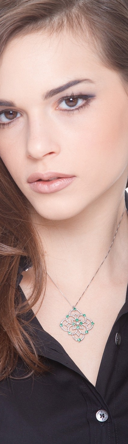 Collana con rosone pendente in oro bianco 18k con smeraldi e diamanti