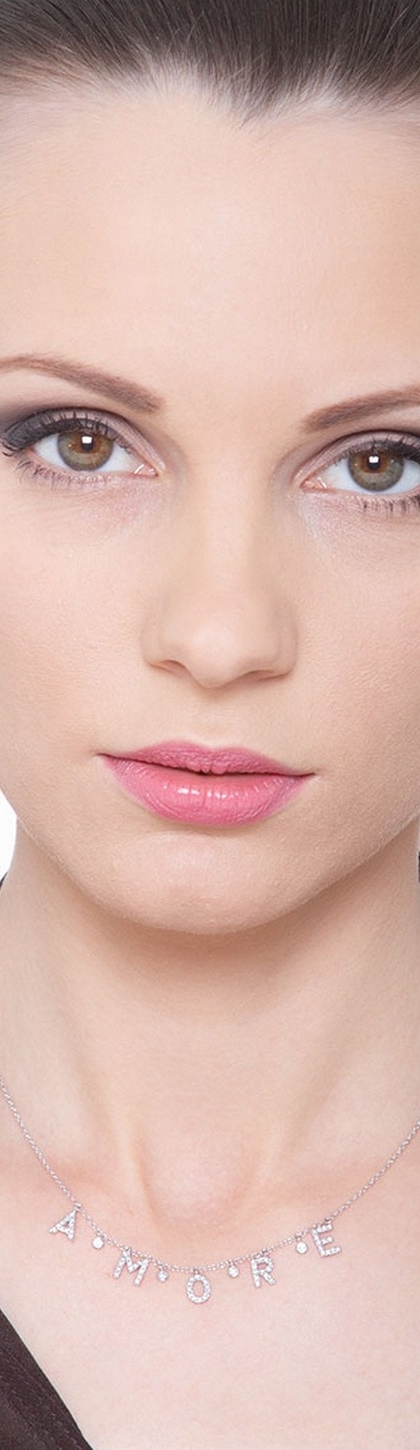 Collana in oro bianco 18k, con la parola AMORE incastonata di diamanti taglio brillante colore G e Purezza Vs. Altezza lettere 7 mm. Le lettere sono intervallate da cipolline con diamante.