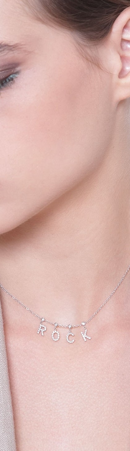 Collana in oro bianco 18k, con la parola ROCK incastonata di diamanti taglio brillante colore G e Purezza Vs. Altezza lettere 7 mm. Le lettere sono agganciate a cipolline con diamante.