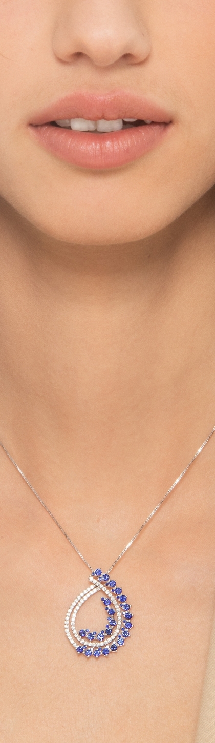 Collana in oro bianco 18k con ciondolo a goccia in zaffiri blu e diamanti
