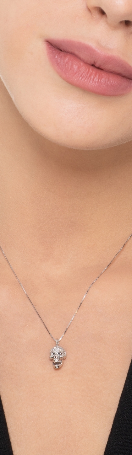 Collana in oro bianco 18k con ciondolo a teschio in diamanti neri e bianchi
