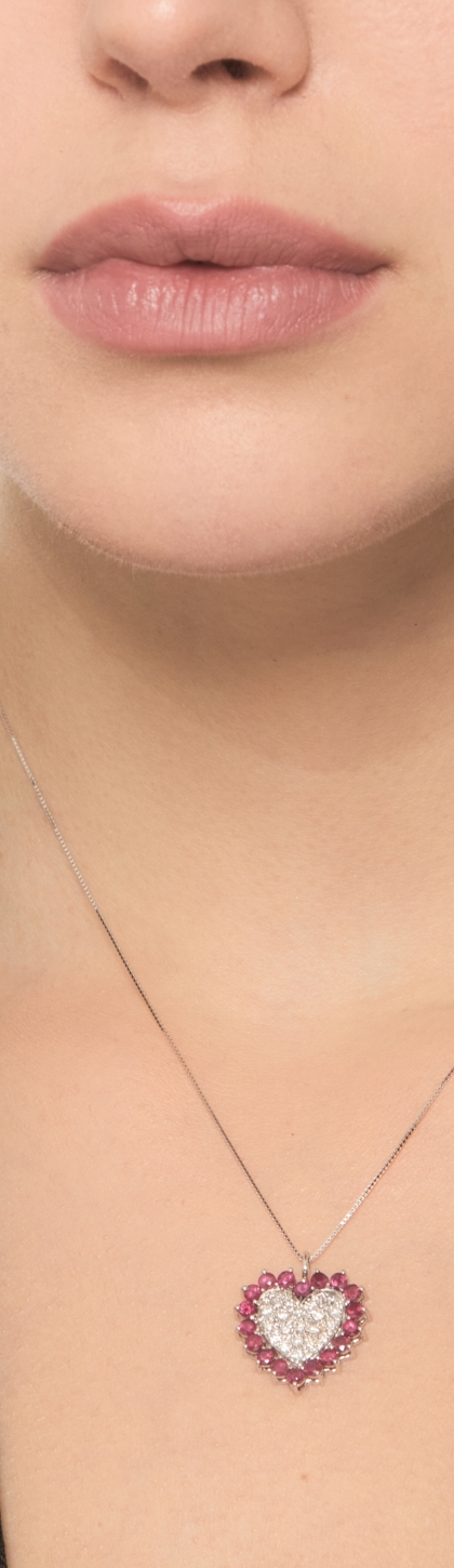 Collana in oro bianco 18k con ciondolo cuore in diamanti e contorno in rubini