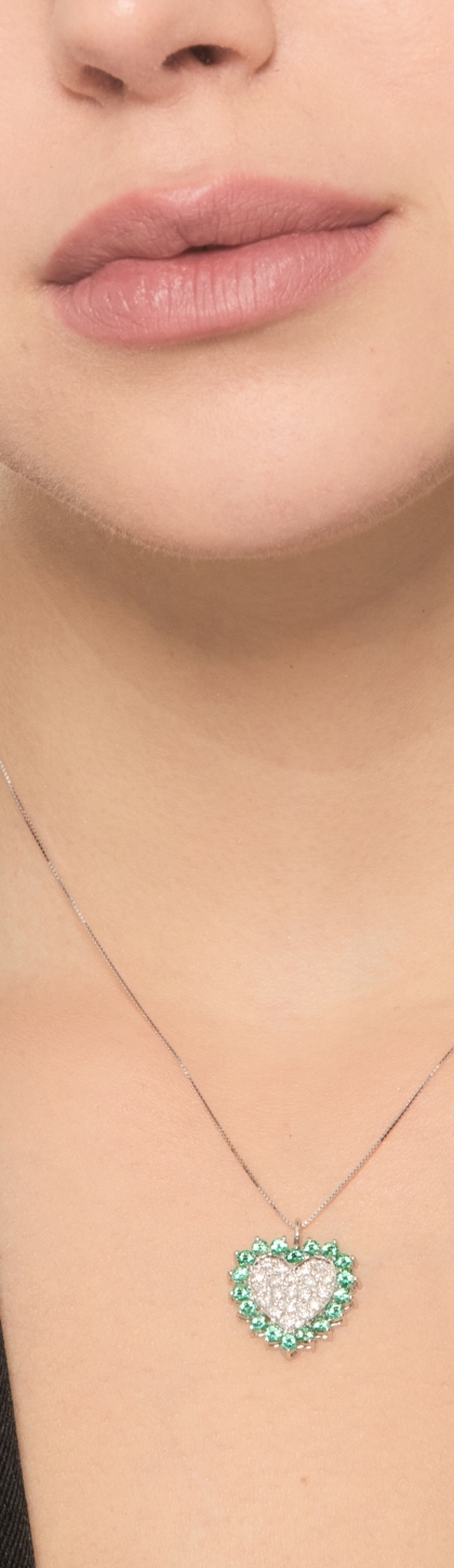 Collana in oro bianco 18k con ciondolo cuore in diamanti e smeraldi