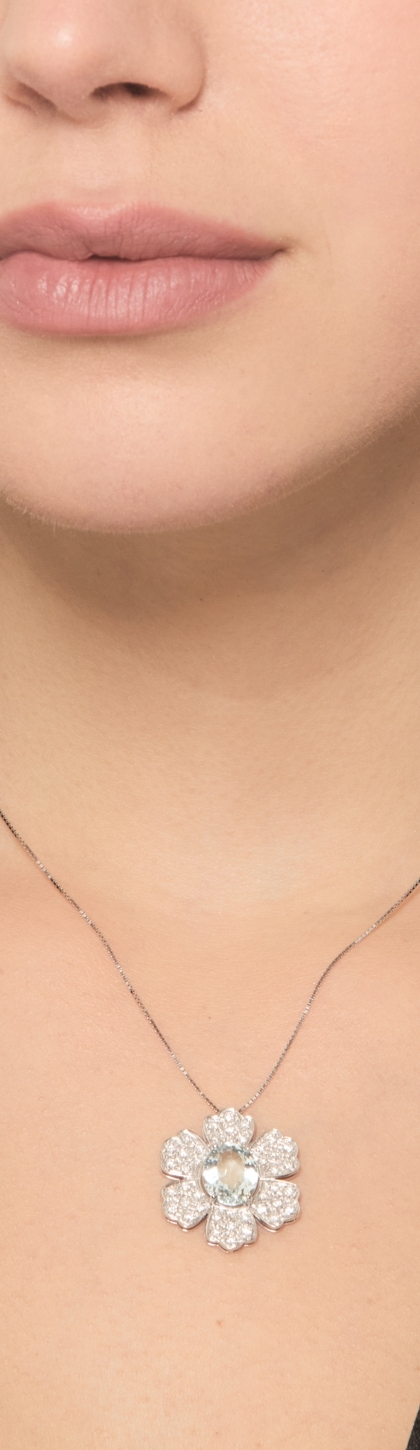 Collana in oro bianco 18k con ciondolo fiore acquamarina e diamanti
