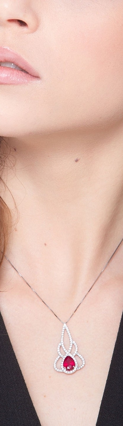 Collana in oro bianco 18k con ciondolo in rubino a goccia e diamanti