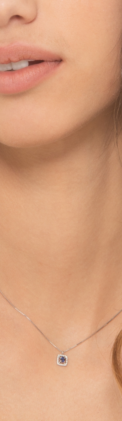 Collana in oro bianco 18k con ciondolo quadrato contorno in diamanti e zaffiro centrale