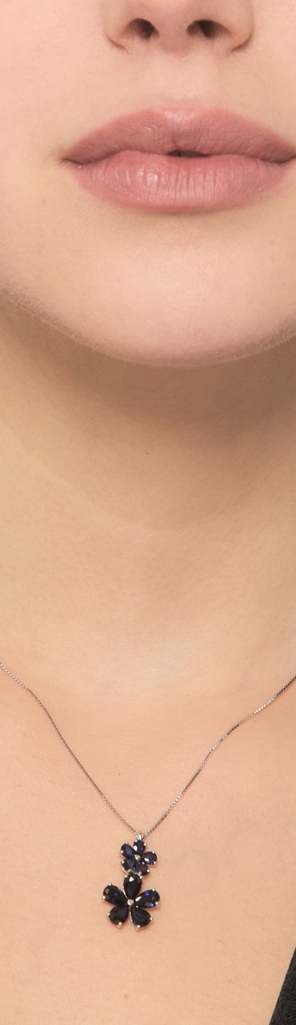 Collana in oro bianco 18k con due fiori in zaffiri blu