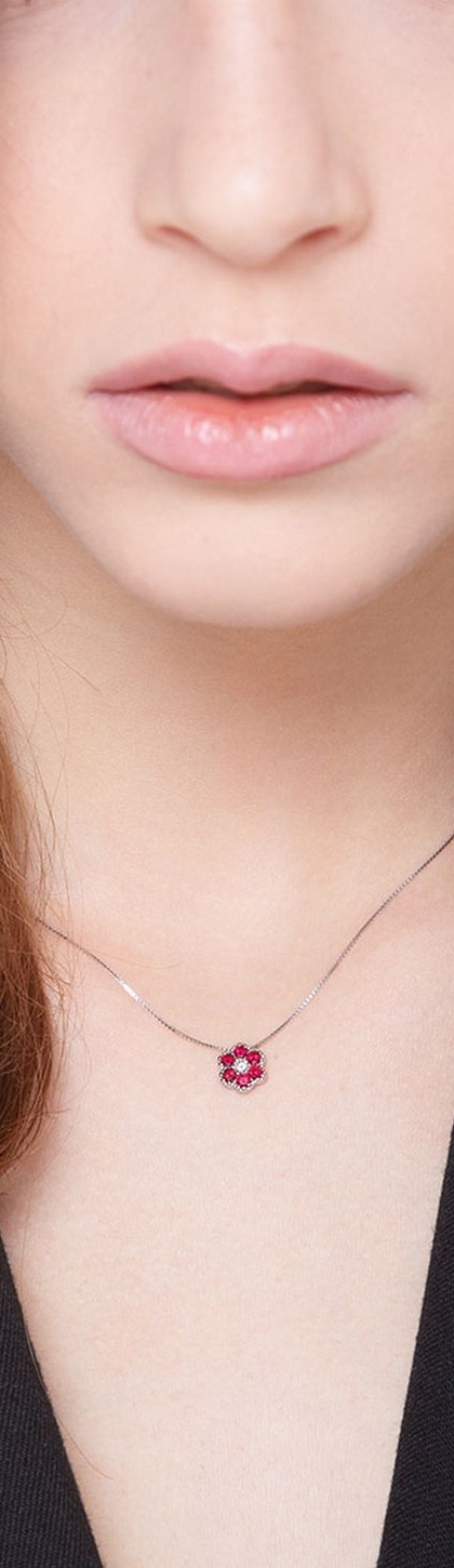Collana in oro bianco 18k con fiore in rubini e diamante