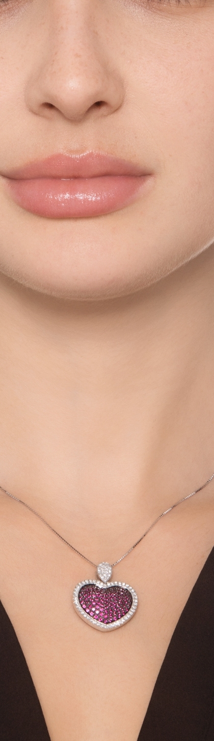 Collana con pendente a cuore in oro bianco 18k. Incastonati diamanti e rubini. Il cuore ha una larghezza di 24 mm.