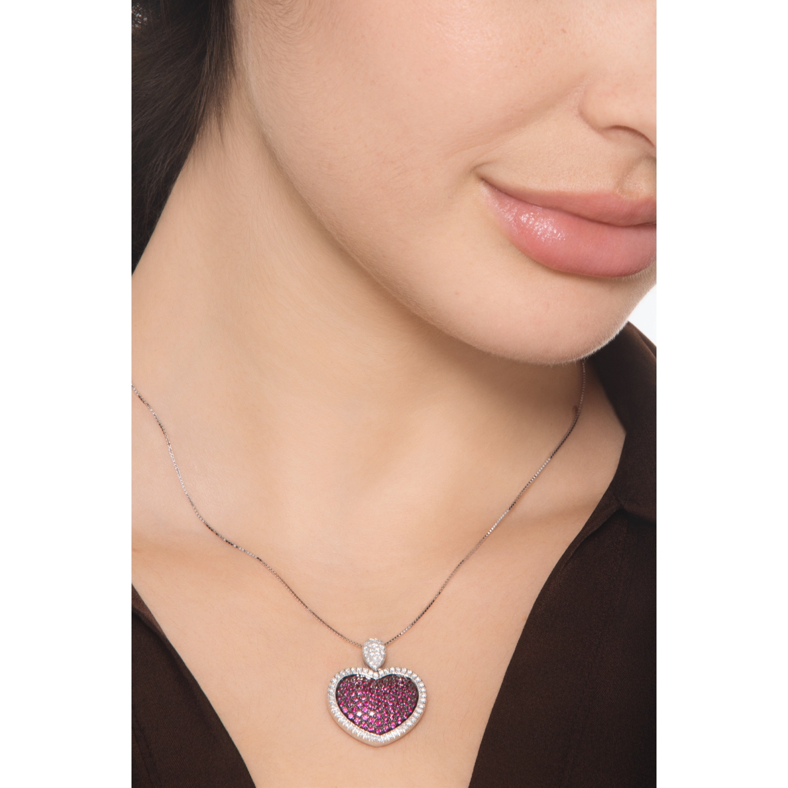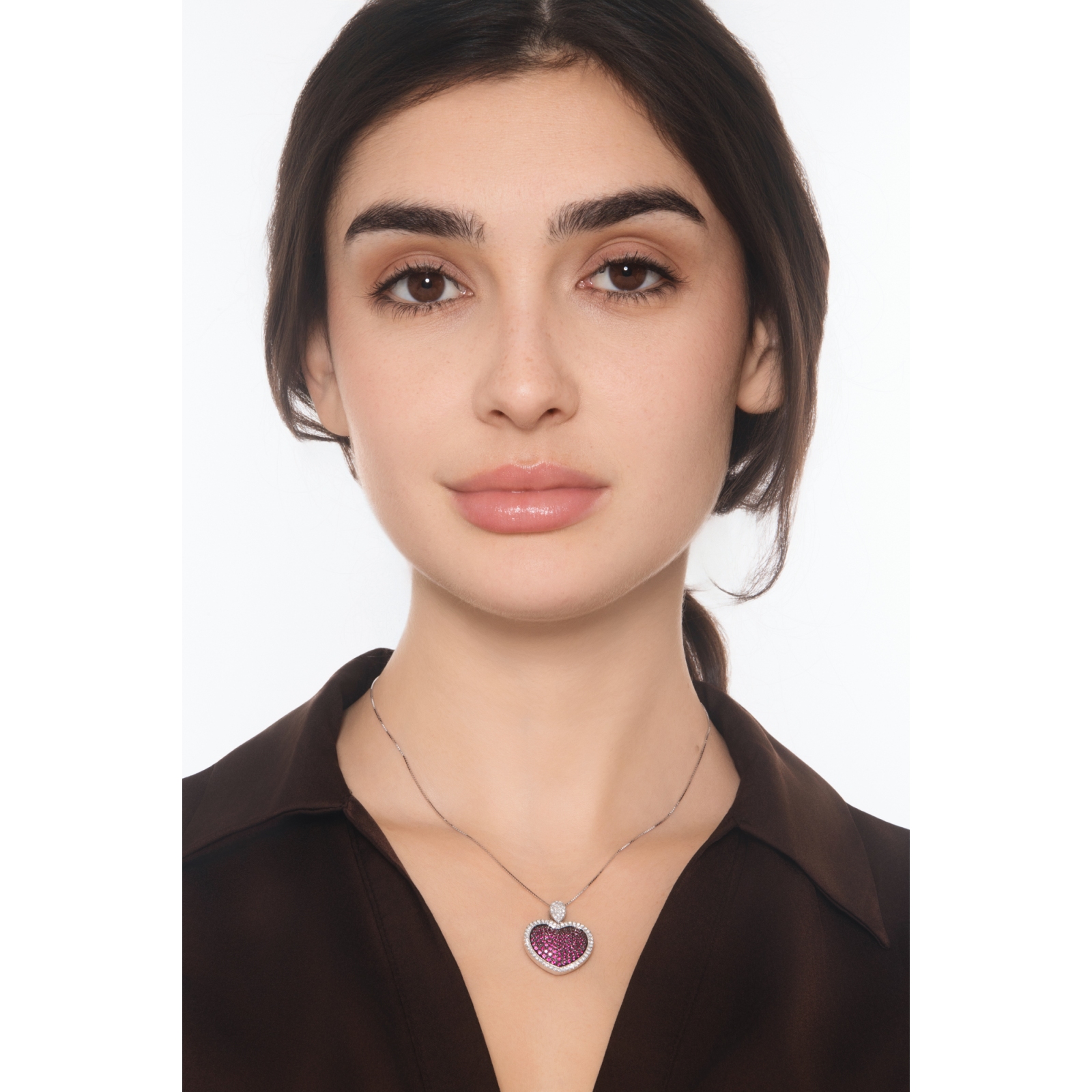 Collana in oro bianco 18k con pendente a cuore diamanti e rubini su punte brunite