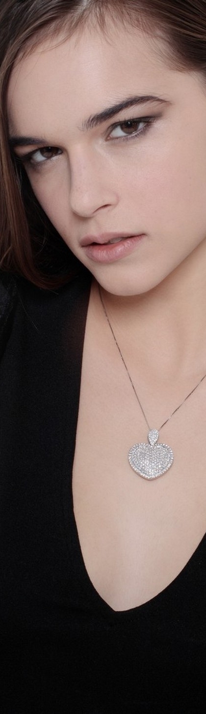 Collana in oro bianco 18k con pendente a cuore in pavè di diamanti taglio brillante colore G purezza Vs. Dimensioni cuore 30 x 25 mm.