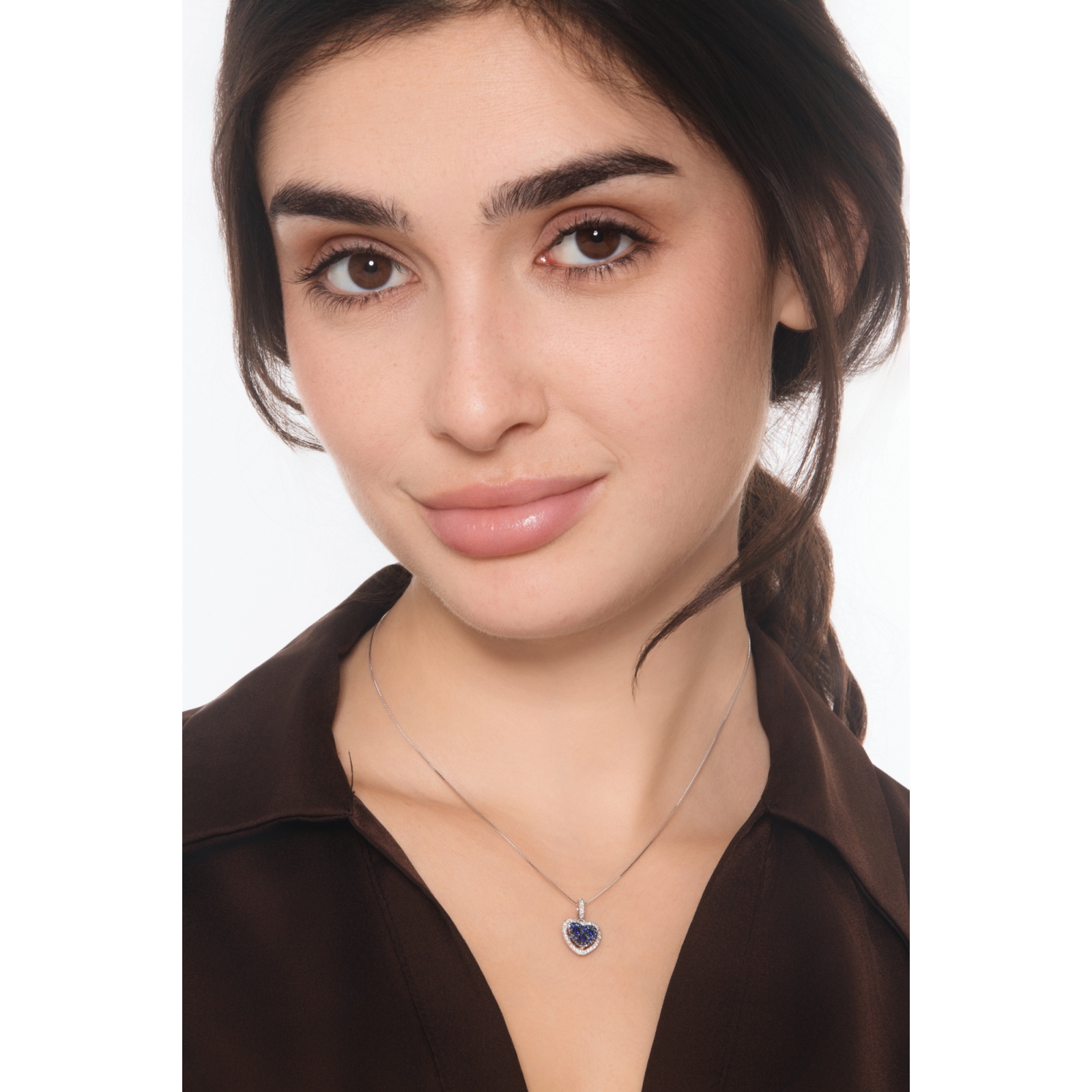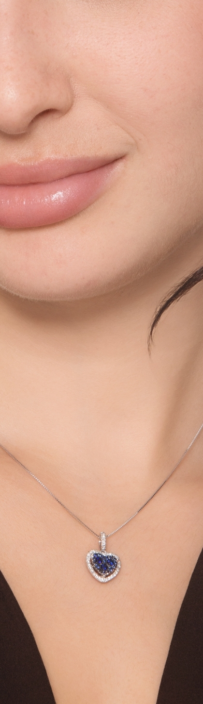 Collana in oro bianco 18k con pendente a cuore in zaffiri blu e diamanti a contorno e sulla biglierina
