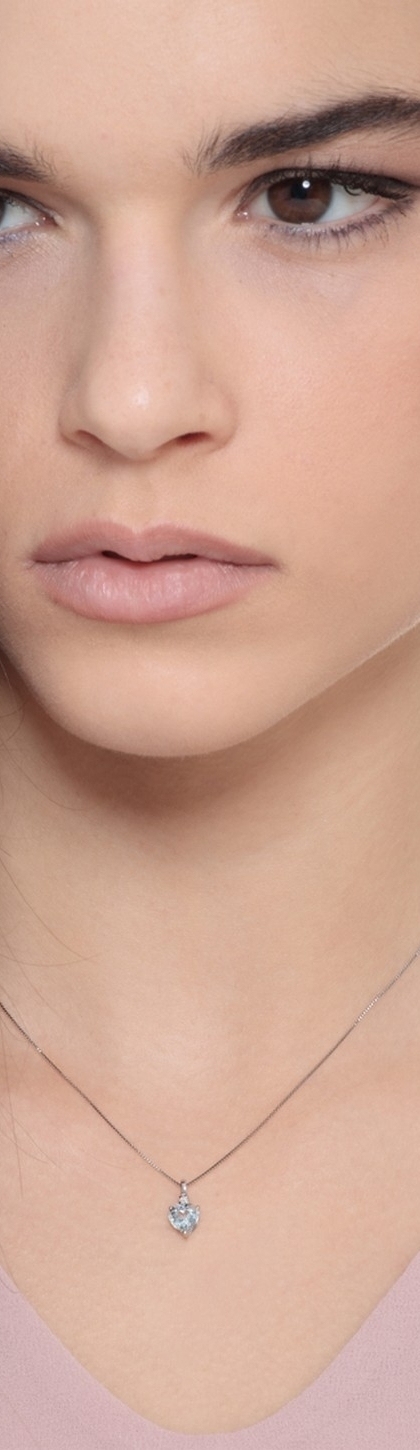 Collana in oro bianco 18k con pendente a cuore in acquamarina e piccolo diamante taglio brillante, colore G purezza Vs. Misura ciondolo 6 mm.