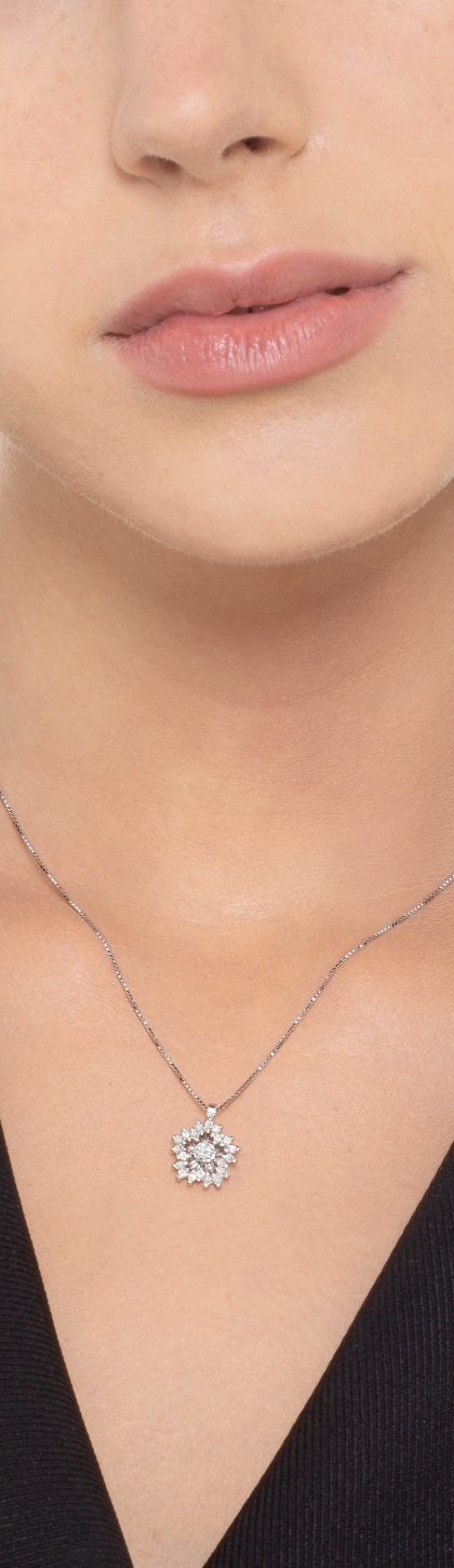 Collana con pendente a fiore in oro bianco 18k, con incastonato al centro un diamante taglio brillante contornato da diamanti taglio brillante colore G purezza VS.
