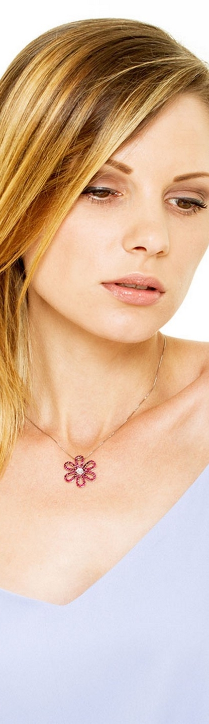 Collana in oro bianco 18k con pendente a forma di fiore in rubini e diamanti