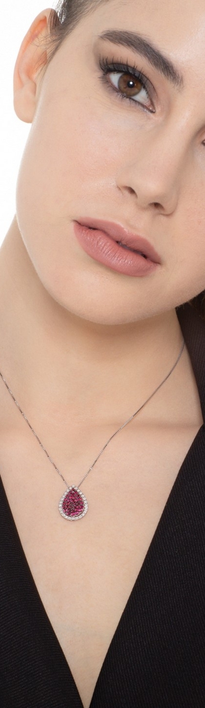 Collana in oro bianco 18k con pendente a goccia di diamanti e rubini