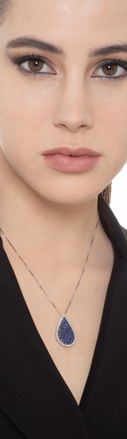 Collana in oro Bianco 18k con pendente a goccia in diamanti e zaffiri blu su pavè brunito