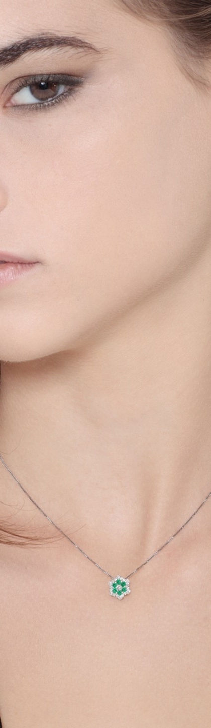 Collana in oro bianco 18k con pendente in diamanti e smeraldi.