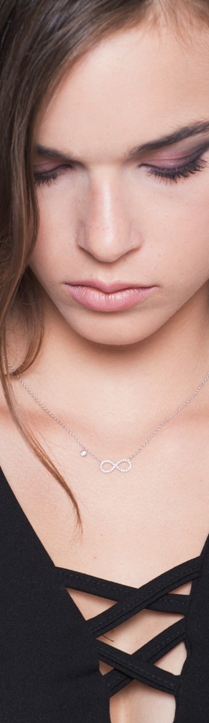 Collana in oro bianco 18k con simbolo infinito e punto luce in diamanti