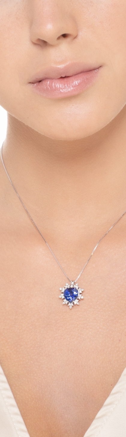 Collana in oro bianco 18k con ciondolo a nove petali con zaffiro blu a cuore di circa 10x10 mm e diamanti taglio brillante, colore G, purezza Vs.
