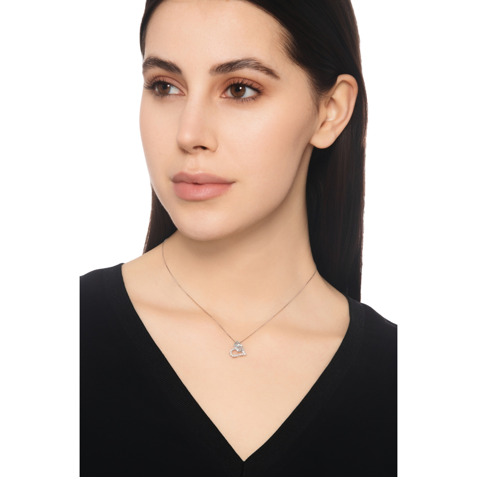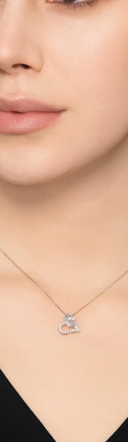 Collana in oro bianco 18k e ciondolo a cuore con 2 acquemarine di circa 5x4 mm e diamanti