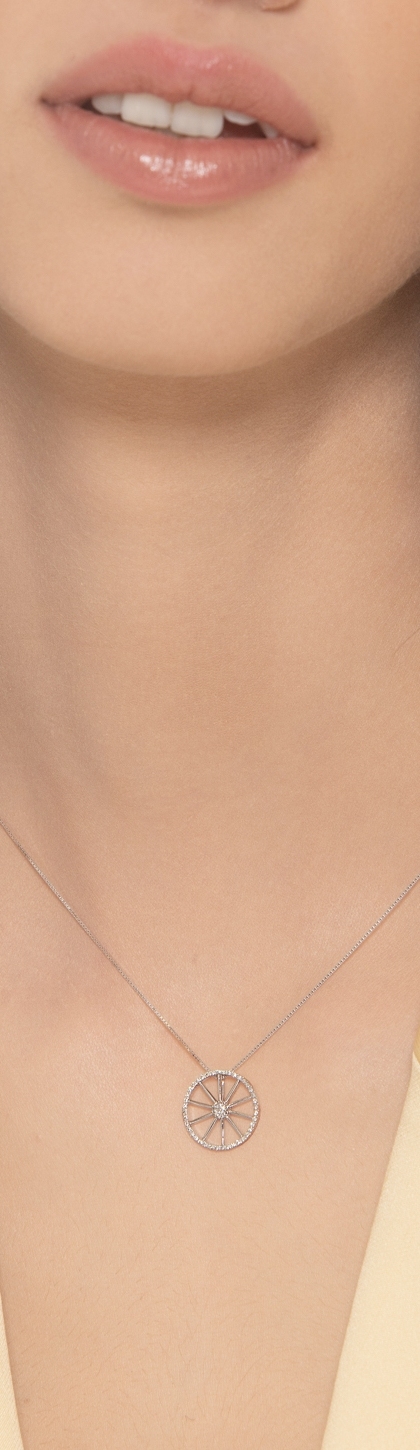 Collana in oro bianco 18k e ciondolo a ruota di circa 14 mm di diametro e diamanti