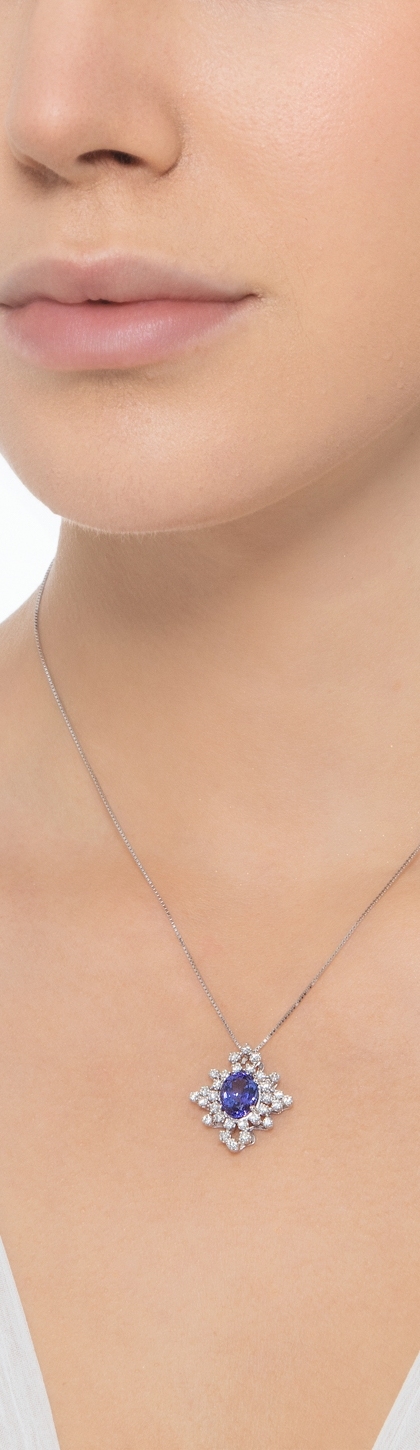 Collana in oro bianco 18k e ciondolo con, al centro, tanzanite ovale e diamanti
