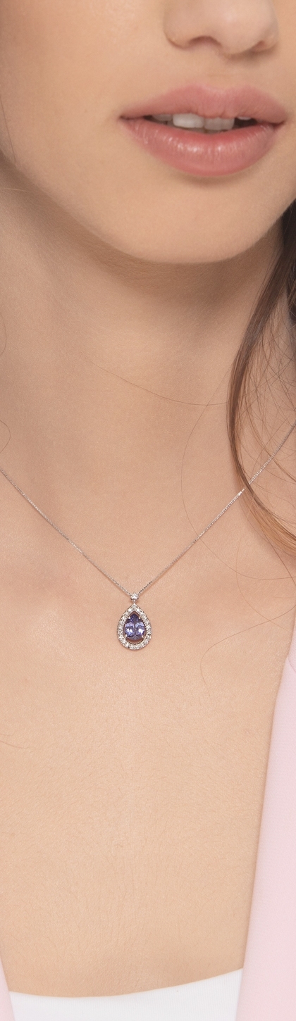 Collana in oro bianco 18k e ciondolo con tanzanite a goccia e diamanti