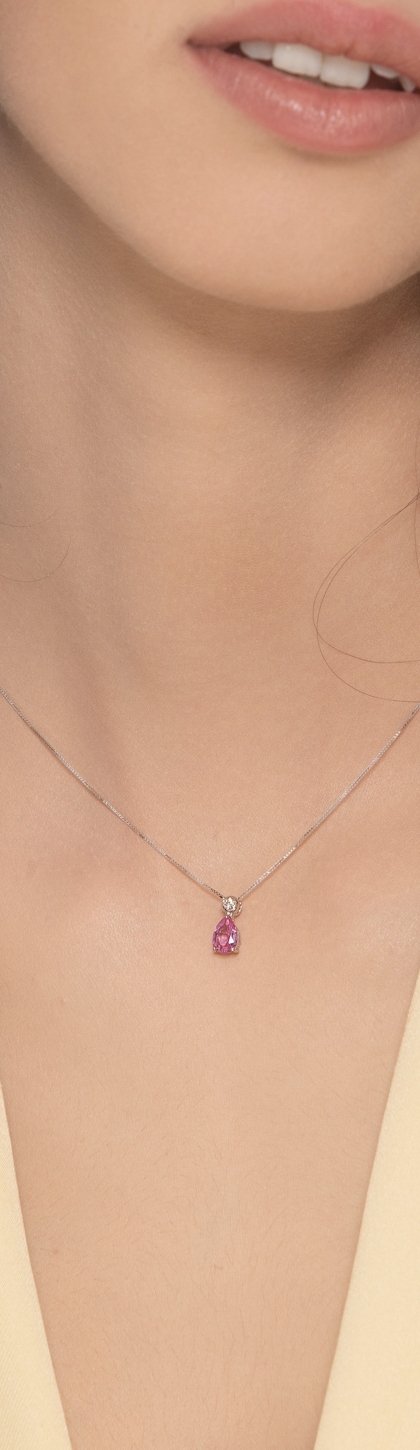 Collana in oro bianco 18k e ciondolo con zaffiro rosa a goccia di circa 7x5 mm e diamante taglio brillante, colore G, purezza Vs.