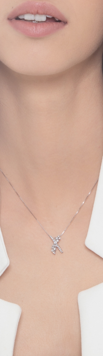 Collana in oro bianco 18k e pendente a incrocio con diamanti taglio brillante.