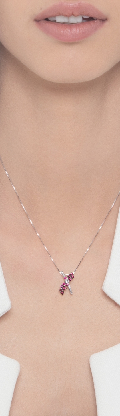Collana in oro bianco 18k e pendente a incrocio con rubini e diamanti, cm 1.70