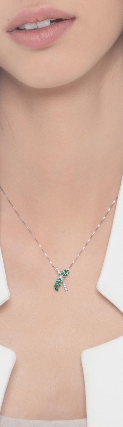 Collana in oro bianco 18k e pendente a incrocio con smeraldi e diamanti, cm 1.70.