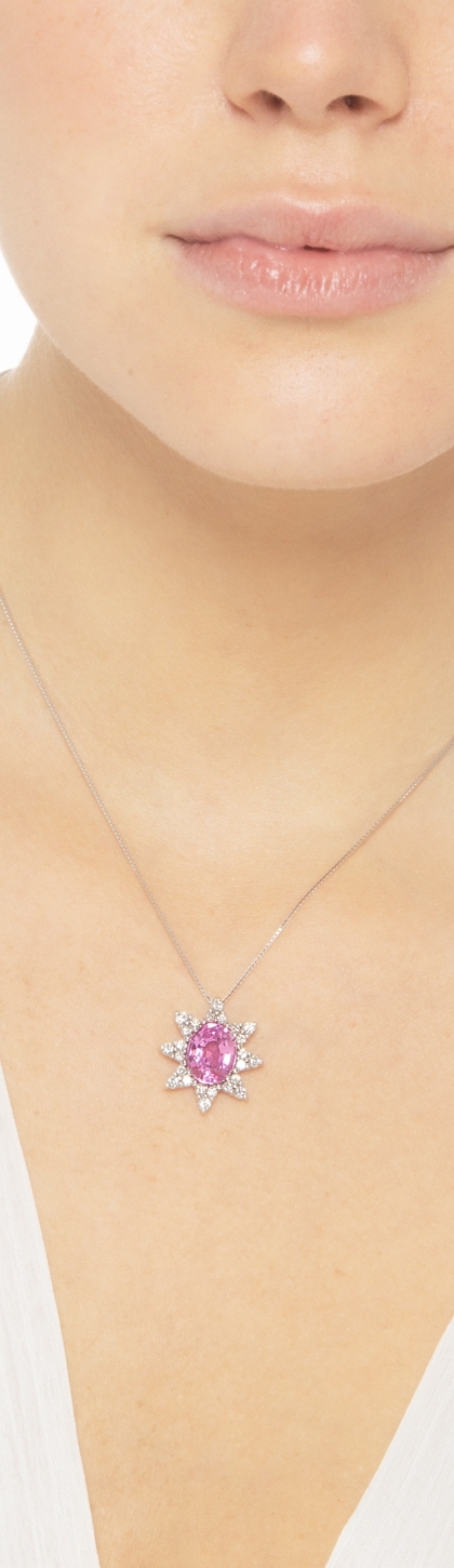 Collana in oro bianco 18k e pendente con grande zaffiro rosa ovale e diamanti negli 8 petali