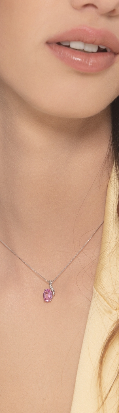 Collana in oro bianco 18k e pendente con zaffiro rosa e diamanti
