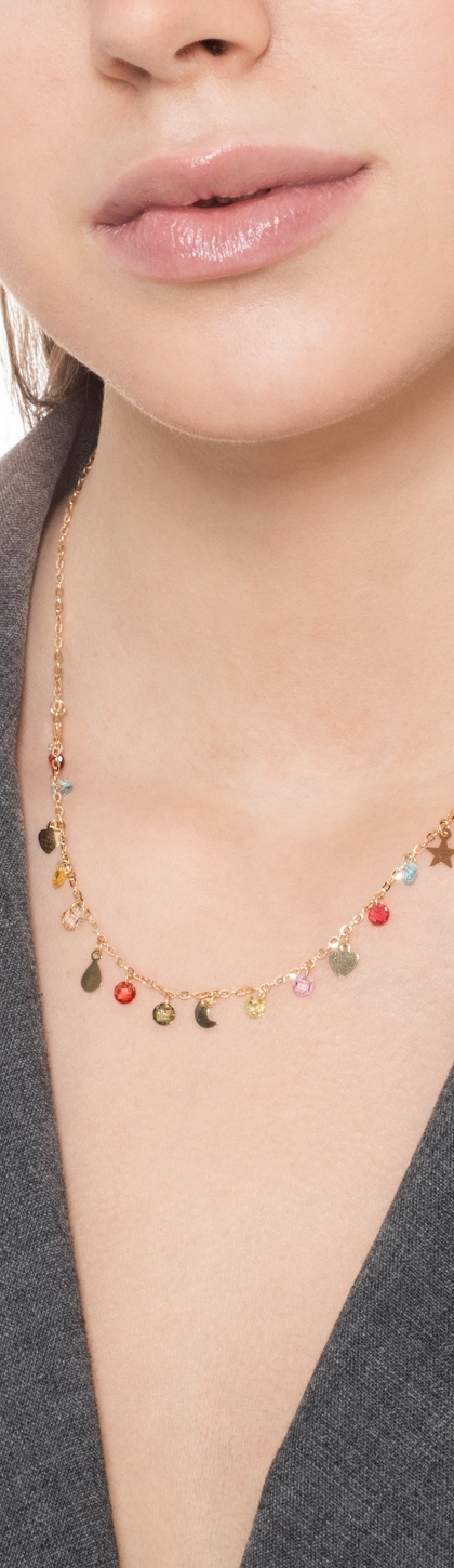 Collana in oro giallo 18k con pietre colorate e charms, cm 42