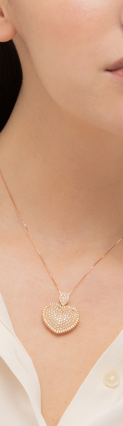 Collana con pendente a cuore in oro rosa 18k con incastonati diamanti taglio brillante Colore G e Purezza Vs. Dimensioni Cuore 24x20 mm.