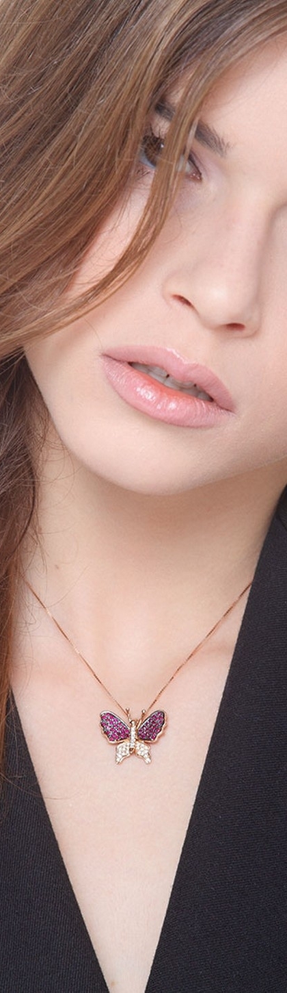 Collana in oro rosa 18k con pendente a farfalla in diamanti e rubini