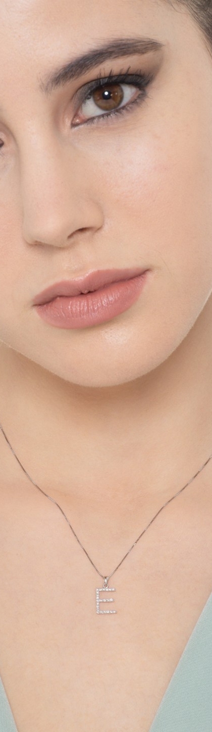 Collana lettera E in oro bianco 18k con diamanti, 1 cm