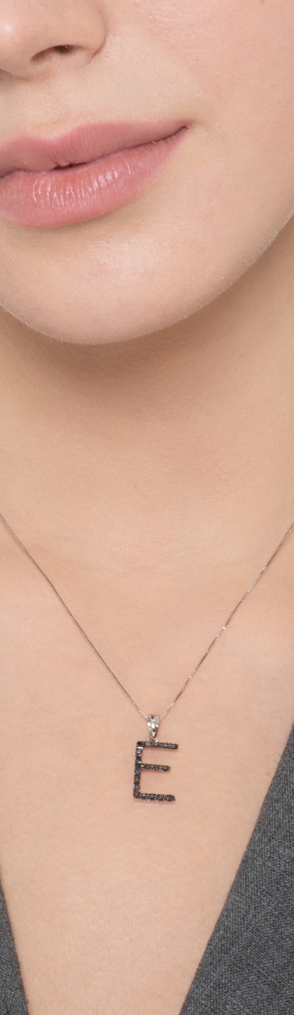 Collana lettera E in oro bianco 18k con diamanti neri