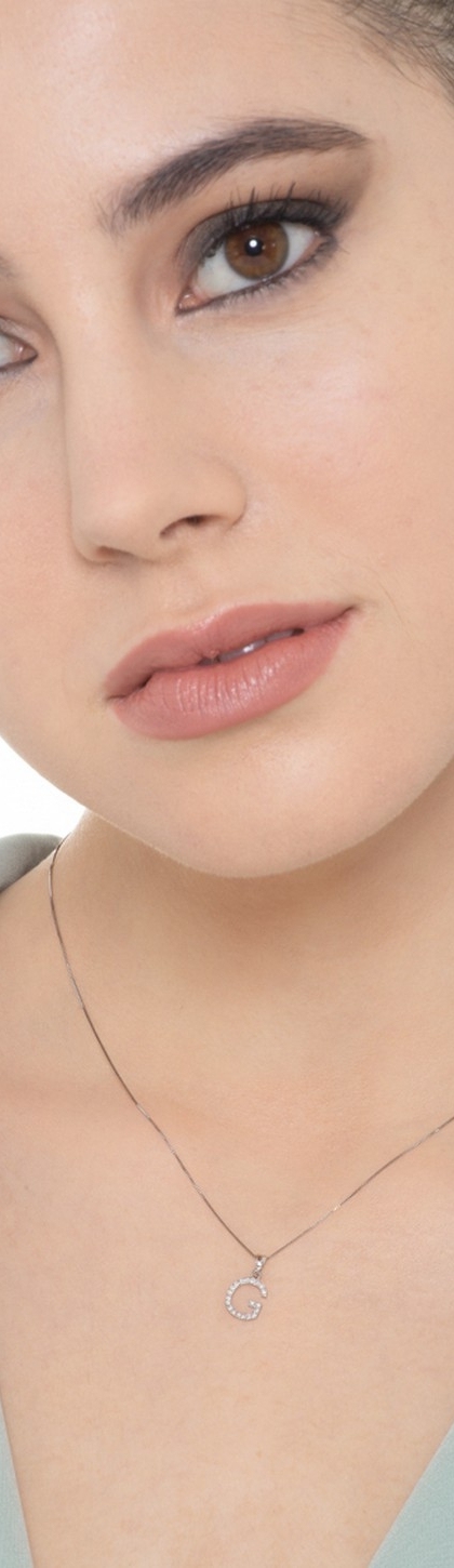 Collana in oro bianco 18k con lettera G, incastonati diamanti taglio brillante, colore G e purezza Vs. Ciondolo cm 0,80.