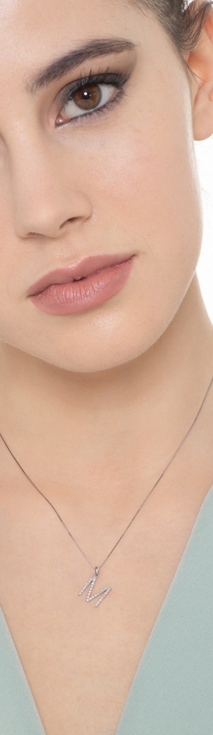 Collana lettera M in oro bianco 18k con diamanti, 1 cm