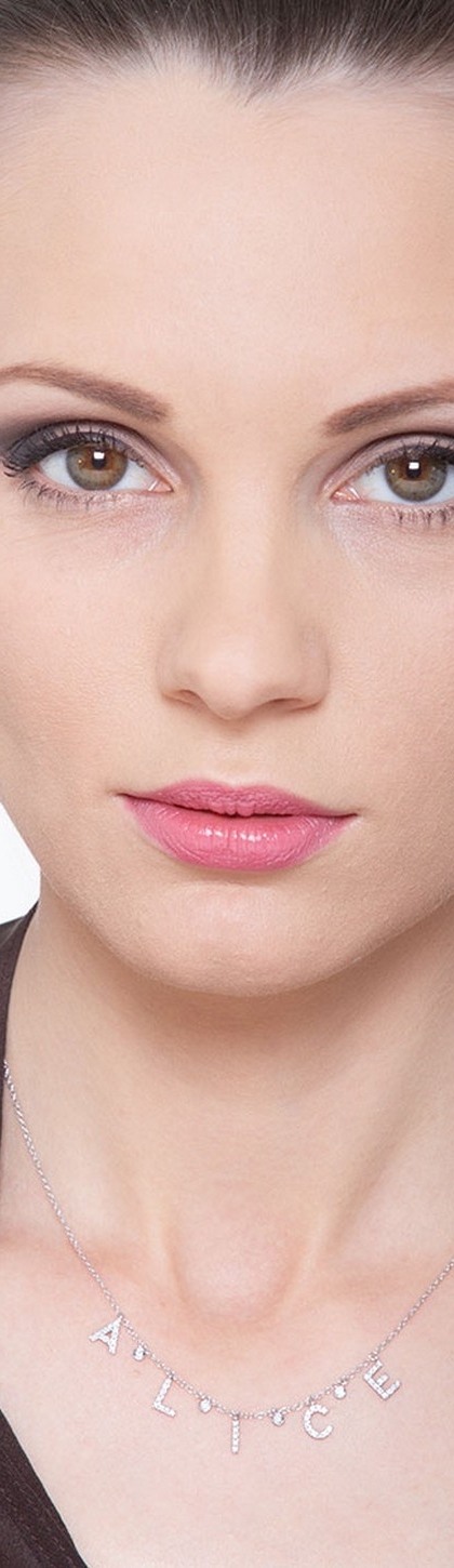 Collana in oro bianco 18k, con il nome ALICE incastonato di diamanti taglio brillante colore G e Purezza Vs. Altezza lettere 7 mm. Le lettere sono intervallate da cipolline con diamante.